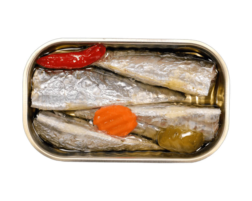 | Összetevők: | Szardínia (70,8%), olívaolaj (23,3%), savanyúságok (sárgarépa (2,5%), uborka (1,7%)), piri-piri (0,3%), só |